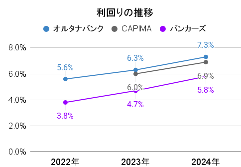 まず、利回りが大幅に上昇したのがオルタナバンク、CAPIMA、バンカーズの3社です。