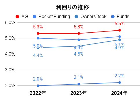 いずれも前年比で0.2%前後上がっています。(AGクラウドファンディングは不動産案件のみ)