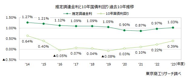 東京商工リサーチが実施したアンケート調査によると、2023年の企業の資金調達金利(=金融機関の貸付金利)は、前年を0.06%上回ったそうです。