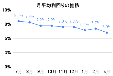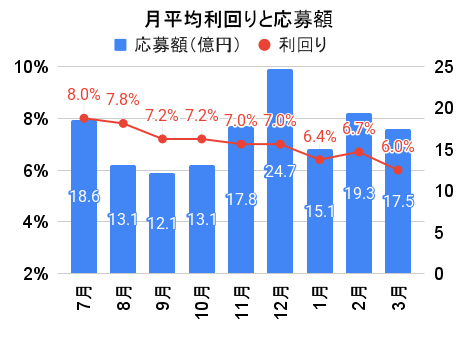 利回りとの関係を見ると、今年2月は利回り8%だった昨年7月より多くの応募が集まりました。