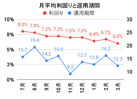 下のグラフは利回り、運用期間、応募額の推移をまとめたものです。